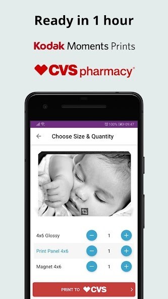 By partnering with CVS we have made it possible to print photos at CSV without using Kodak photo kiosk. The app gives access to over 9600 CVS stores nationwide to print 4x6, 4x4, 6x6, 8x8 & 8x10 prints in 1 hour. Displaying pictures on your wall or sharing pictures with your family could never be easier.